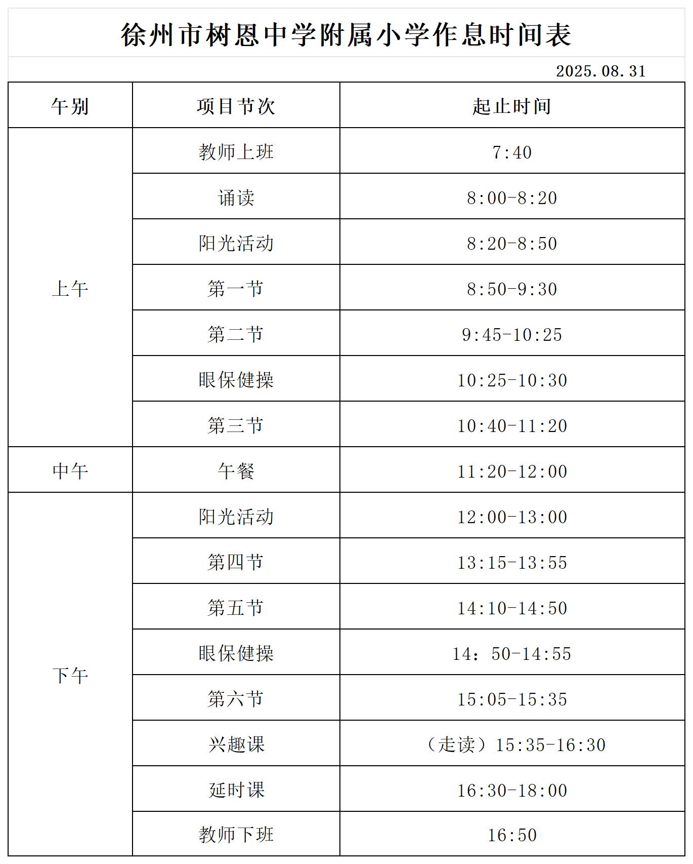 徐州市树恩中学附属小学总课表2025至2026学年度第一学期